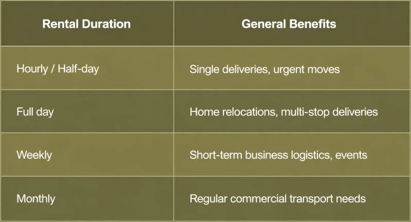 Here's something worth knowing: renting bigger doesn't always mean getting more done. Hiring a 7-ton truck when you only have 2 tons of goods wastes money on fuel, rental rates, and driver time. A 3-ton pickup for rent in Dubai is priced competitively — most services offer hourly, daily, and monthly rates — and you only pay for what you need.